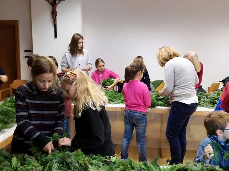 Wie jedes Jahr zu Adventsbeginn stellen sich kfb-Frauen zur Verfügung, um den Jungscharkindern beim Winden der Adventkränze behilflich zu sein.