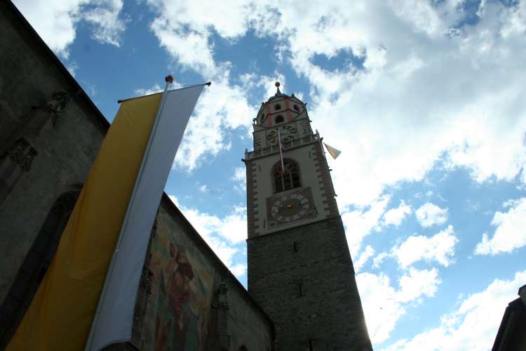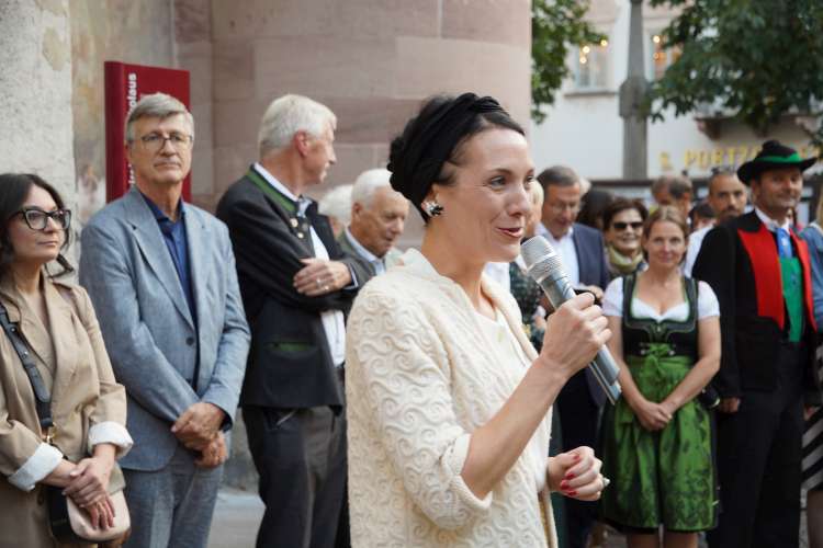 Am Beginn der Einstandsfeier vor dem noch verschlossenen Kirchenhauptport hieß Merans Bürgermeistern Katharina Zeller Don Mario Gretter in seiner Geburtsstadt herzlich willkommen und sicherte ihm die Bereitschaft der Stadtgemeinde Meran zur Zusammenarbeit zu.