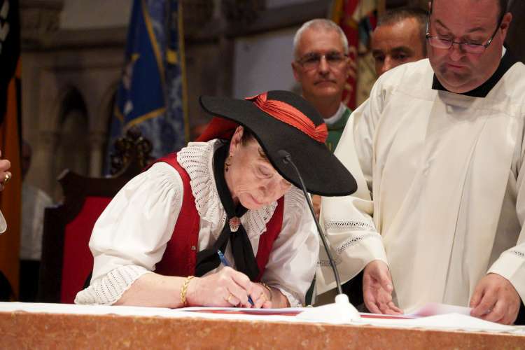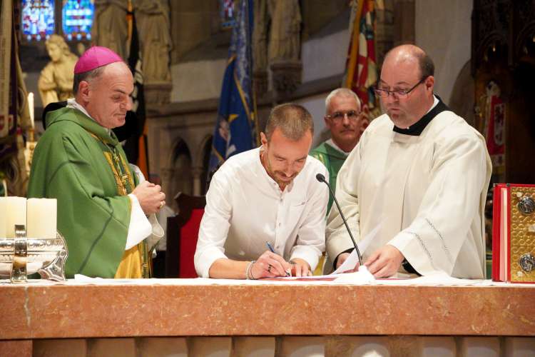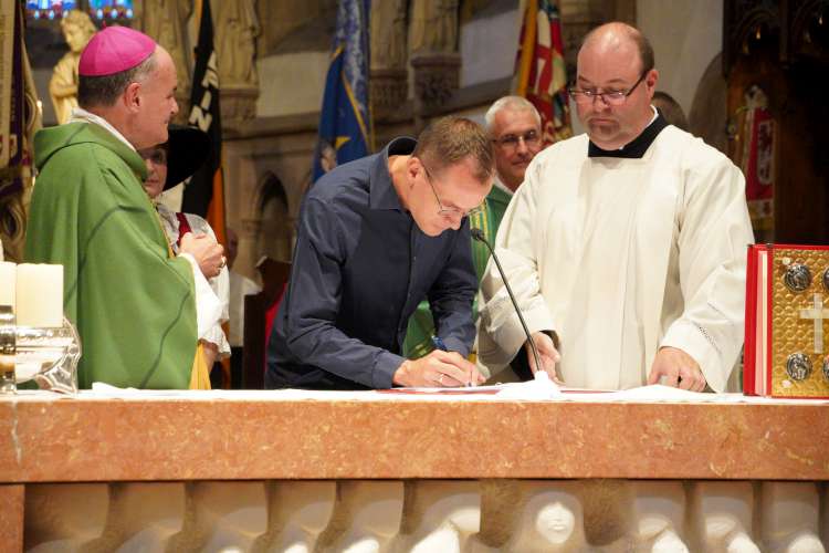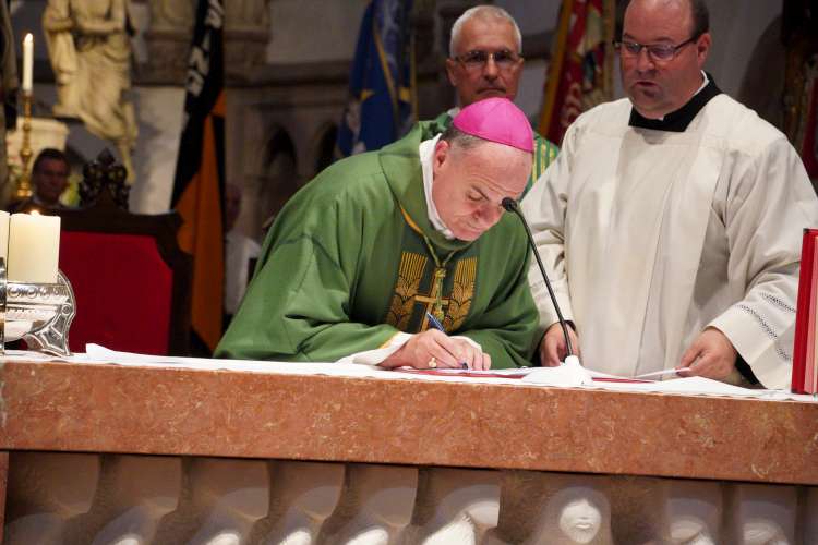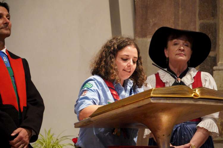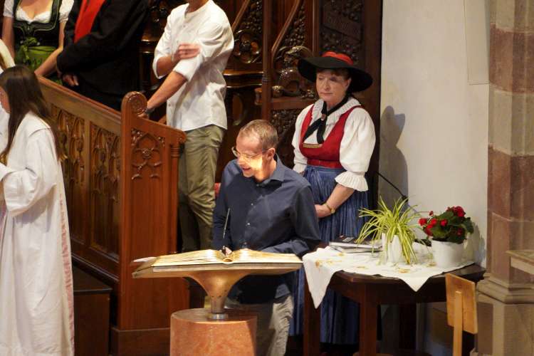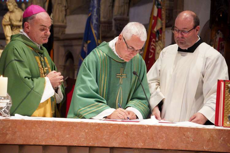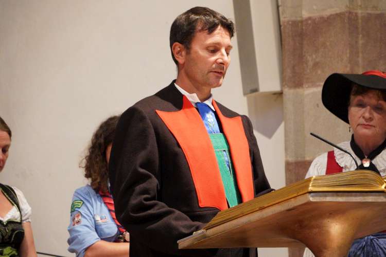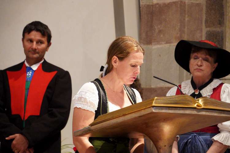 Nach Überreichen des Evangelienbuches durch Bischof Ivo Muser an Dekan Mario Gretter und der Unterzeichnung des Protokolls war die Amtsübergabe  besiegelt. Die Kirchenbesucher applaudierten – und Don Mario musste vor Beginn seiner Grußworte einmal tief durchatmen: „Ich weiß, die Erwartungen sind hoch – und so stehe ich unter Leistungsdruck  – die Hoffnung enttäuscht jedoch nie! Ihr bekommt nun ein Drittel eines Pfarrers. Das ist besser als nichts, werden nun einige von Euch denken.” Zudem sprach er den Wunsch aus, dass am kommenden Sonntag wieder so viele Menschen die Heilige Messe besuchen…!“
