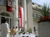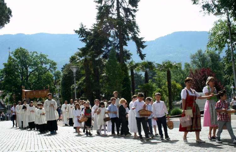 Unter den Klängen der Stadtmusikkapelle Meran führte der Weg vom Pfarrplatz über die Leonardo-da-Vinci-Gasse zur Promenade, wo vor dem Kurhaus eine “Statio” mit sakramentalem Segen abgehalten wurde. Danach nahm die Fronleichnamsprozession den Weg über die Promenade, die Sparkassenstrasse und den Oberen Lauben zurück zum Unteren Pfarrplatz. Die Monstranz wurde von den Dekanen Hans Pamer und Gabriele Pedrotti getragen. Ein festliches Bild boten die vielen geschmückten Fassaden in der Meraner Altstadt.