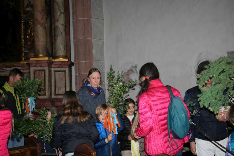 Bereits am Vortag fanden sich die Kinder zum Binden der Palmbuschen in der Barbarakapelle ein. Gemeinsam mit ihren Eltern und unter der fachkundigen Anleitung von Isabella Schenk sowie den kfb-Frauen Nanny und Waltraud flochten die Kinder ansehnliche Buschen aus Olivenzweigen und Grünzeug, verziert mit bunten Bändern.