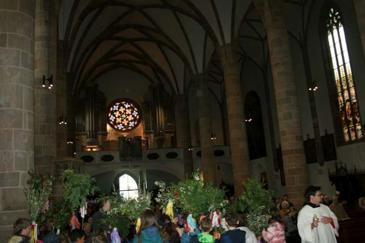 Viele Gläubige und Kinder versammelten sich vor Beginn des Gottesdienstes vor der Barbarakapelle, um – nach der Palmenweihe durch Dekan Hans Pamer – feierlich in die Stadtpfarrkirche einzuziehen.